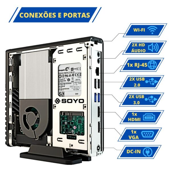Portas Externas: “Traseiras – 1x Conector DC-In / 1x HDMI / 1x VGA / 4x USB 3.0 / 1 x RJ-45 / 2x Conectores de áudio